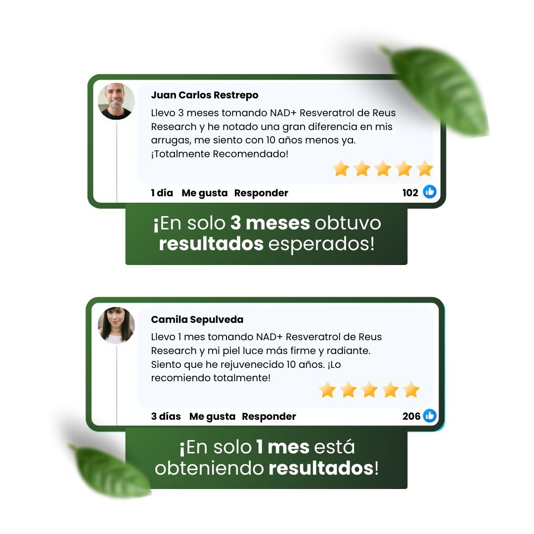 Los testimonios, estudios de casos y ejemplos mostrados en esta página reflejan la experiencia de algunos usuarios de productos como NAD + Resveratrol Reus Research USA y productos relacionados. Si bien estos testimonios representan casos reales, no garantizamos que todos los usuarios logren los mismos resultados.
